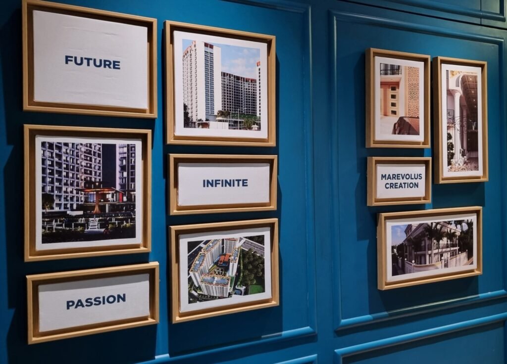 To highlight the conglomerate's immense scale, a series of large square frames was installed. Each frame is dedicated to one of the various diverse industries they operate in, from real estate to complex investments.